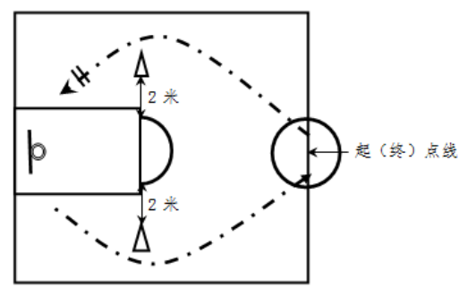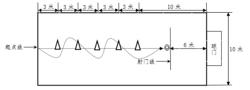 在长25米、宽10米的场地进行。起点线至第一根标志杆距离为3米,各标志杆间距3米,共放置5根高1.2米的标志杆,标志杆距两侧边线各5米,球门高2米、宽5米,射门线距球门线中点垂直距离为6米,起点线中点为出发点,点、杆在一条直线上(见图示)。